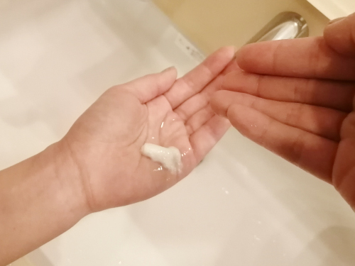 手のひらをくぼませ、水かぬるま湯を2~3適加えて手のひら全体になじませます。この時、やさしく指先で空気を含ませるように泡立てていきます。